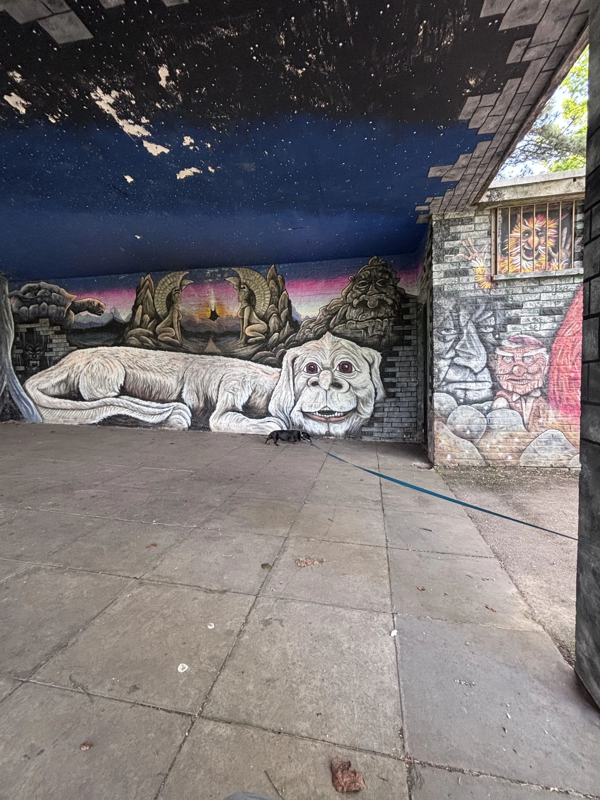 On our return to the car we went back to the cafe for an ice cream, and then continues along the flat path, where we came across some fun murals, one for Leprechaun and one for Neverending Story, they were fun to look at, even Betty appreciated the artwork. This area was flagged, so there were a few uneven parts, but no issue for the scooter. a little further along we came across a fountain and garden area, which was very ornamental and lovely to look at, the ground here was a little uneven but nothing too concerning. And another opportunity for Betty to explore new areas.